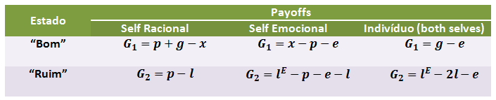 Fazer esforço é necessário mas não suficiente para ter sucesso. Afinal de contas, como dito no começo do post, a vida não está completamente sob nosso controle. Para os fins desse modelinho que estou construindo, isso vai significar que o mundo estará em um de dois possíveis estados: um estado “bom” (1), onde os esforços de auto-controle do self emocional funcionam e um estado “ruim”(2) onde nosso auto-controle falha e o lado emocional, o bon vivant, domina nossas ações e, por suposição, sabotam os planos de sucesso desenhados pelo lado racional. O estado “bom” tem probabilidade q de ocorrer e o estado “ruim” tem probabilidade (1-q) de ocorrer. A segunda e terceira coluna da tabela abaixo descreve os ganhos (G) de cada self em cada estado possível do mundo. Os ganhos do indivíduos são apenas a soma dos ganhos dos selves – o que captura a ideia de que, na medida do possível, o indivíduo deve satisfazer a ambos.