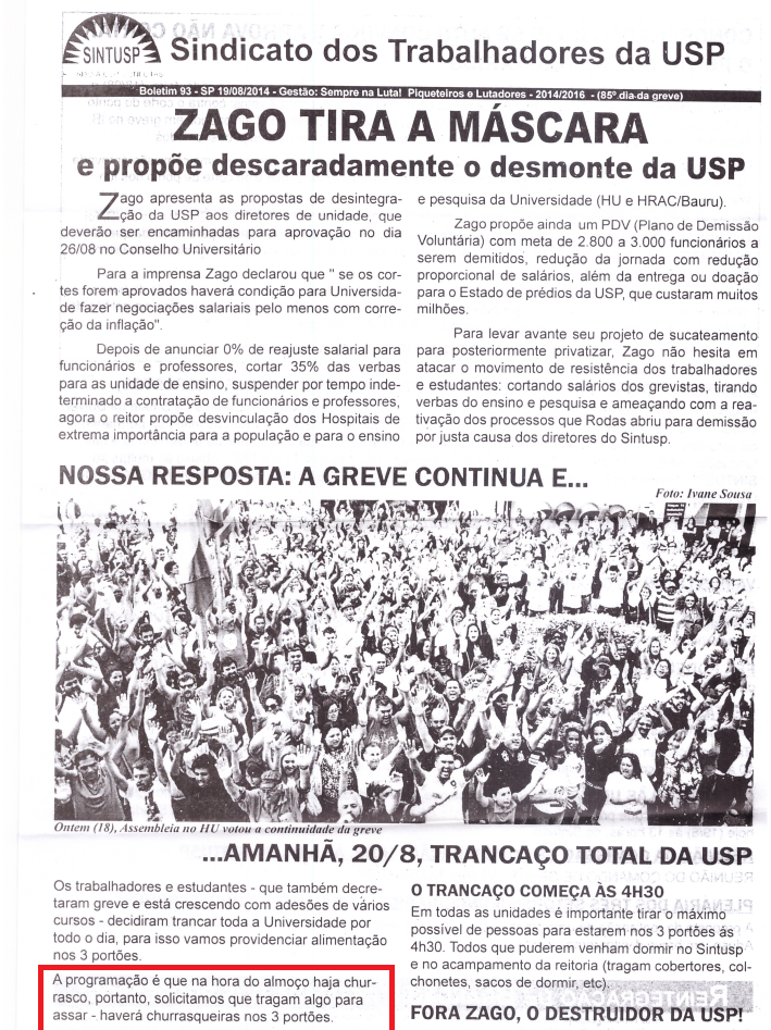 Parece piada, mas não é. Amanhã teremos outro trancaço da USP. Veja abaixo o panfleto que o Sindicato dos Trabalhadores da USP distribuiu convocando seus filiados para a manifestação.